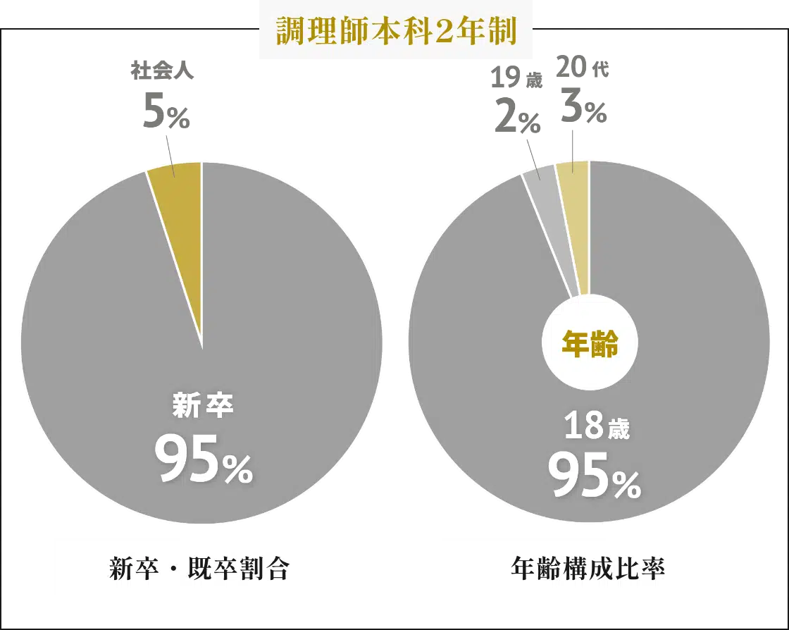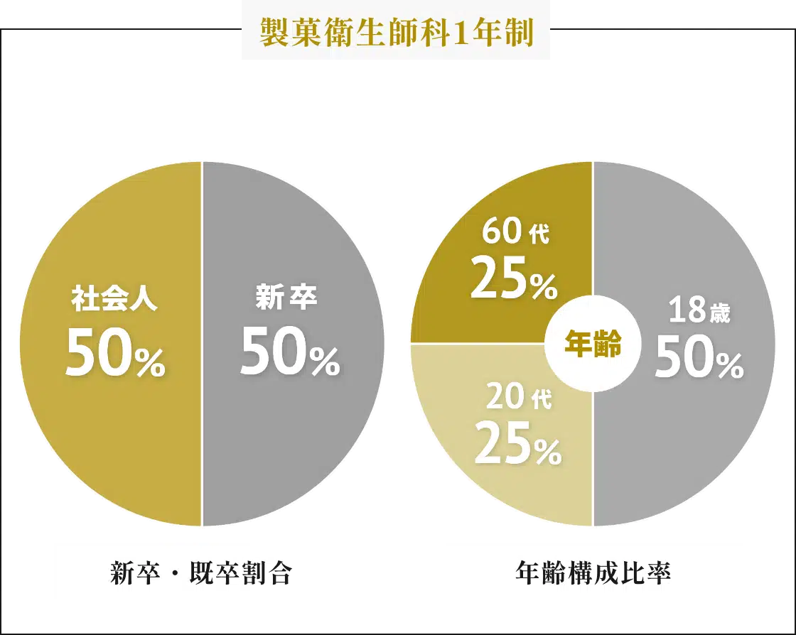 食の仕事に興味を持ち異業種から学び直したい方、基本技術の習得のため一から調理や製菓を学びたい方、定年を機に興味があった食について学びたい方、自分の店を持ちたいという夢を叶えるために学びたい方、家業を継ぐために学びたい方など、目的や経緯はもちろん様々な年代の方が毎年入学し、高校を卒業したばかりの学生と一緒に学んでいます。