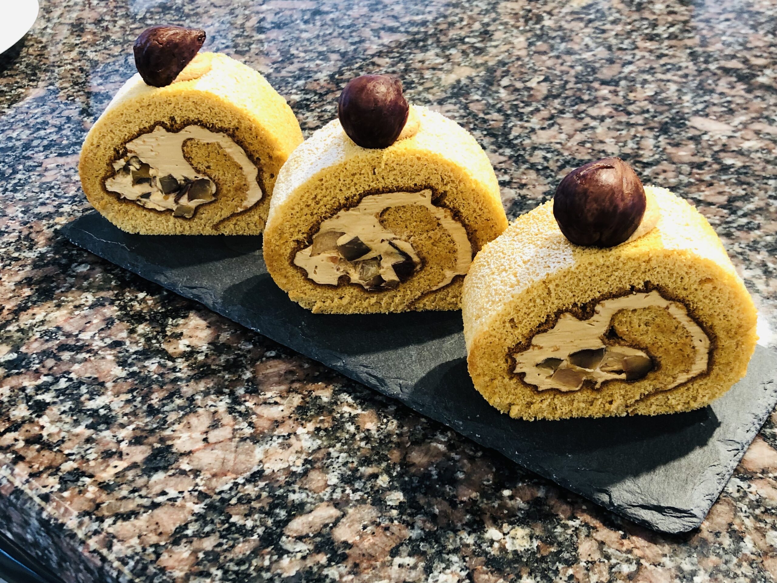 製菓実習体験では「栗とキャラメルのロールケーキ」を作ります!作ったケーキはお持ち帰りできます♪