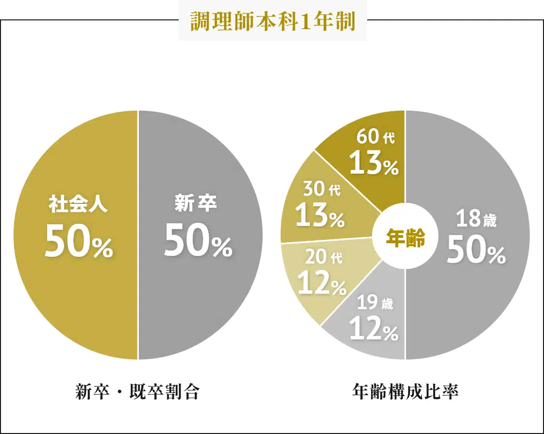食の仕事に興味を持ち異業種から学び直したい方、基本技術の習得のため一から調理や製菓を学びたい方、定年を機に興味があった食について学びたい方、自分の店を持ちたいという夢を叶えるために学びたい方、家業を継ぐために学びたい方など、目的や経緯はもちろん様々な年代の方が毎年入学し、高校を卒業したばかりの学生と一緒に学んでいます。